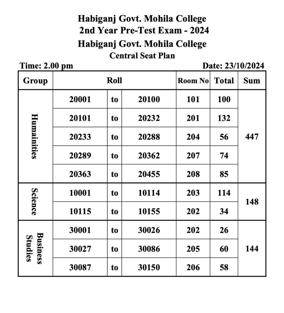 ৯। দ্বাদশ প্রাক-নির্বাচনী পরীক্ষা- ২০২৪ এর আসন বিন্যাস; তারিখ: ২৩ অক্টোবর, ২০২৪
